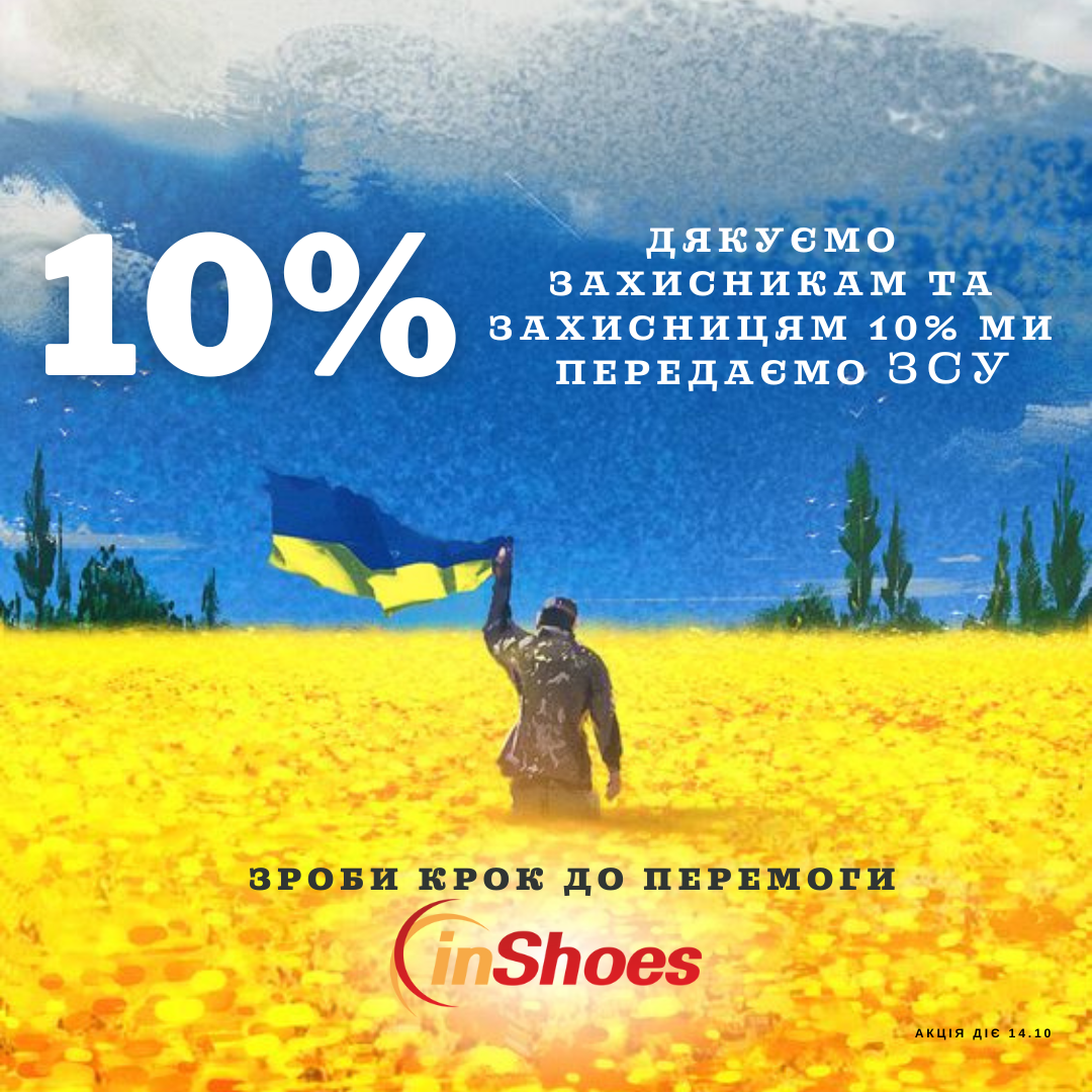 Підтримайте армію разом з мережею магазинів одягу та взуття Ін Шуз14 жовтня здійсніть покупку в мережі магазинів Ін Шуз, і 10 % від суми в чеку будуть передані на потреби ЗСУ