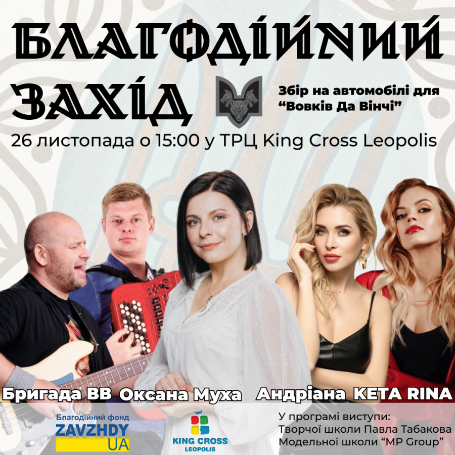 26 листопада о 15:00 на сцені нашого ТРЦ виступатимуть Оксана Муха, KETA RINA , Андріана та "Бригада BB"— виконавці, які вже не вперше збирають кошти для ЗСУ. Також до програми приєднаються Творча школа Павла Табакова та модельна школа MP Group, тож радимо приходити всім: від малюків до їхніх поважних дідусів та бабусь.