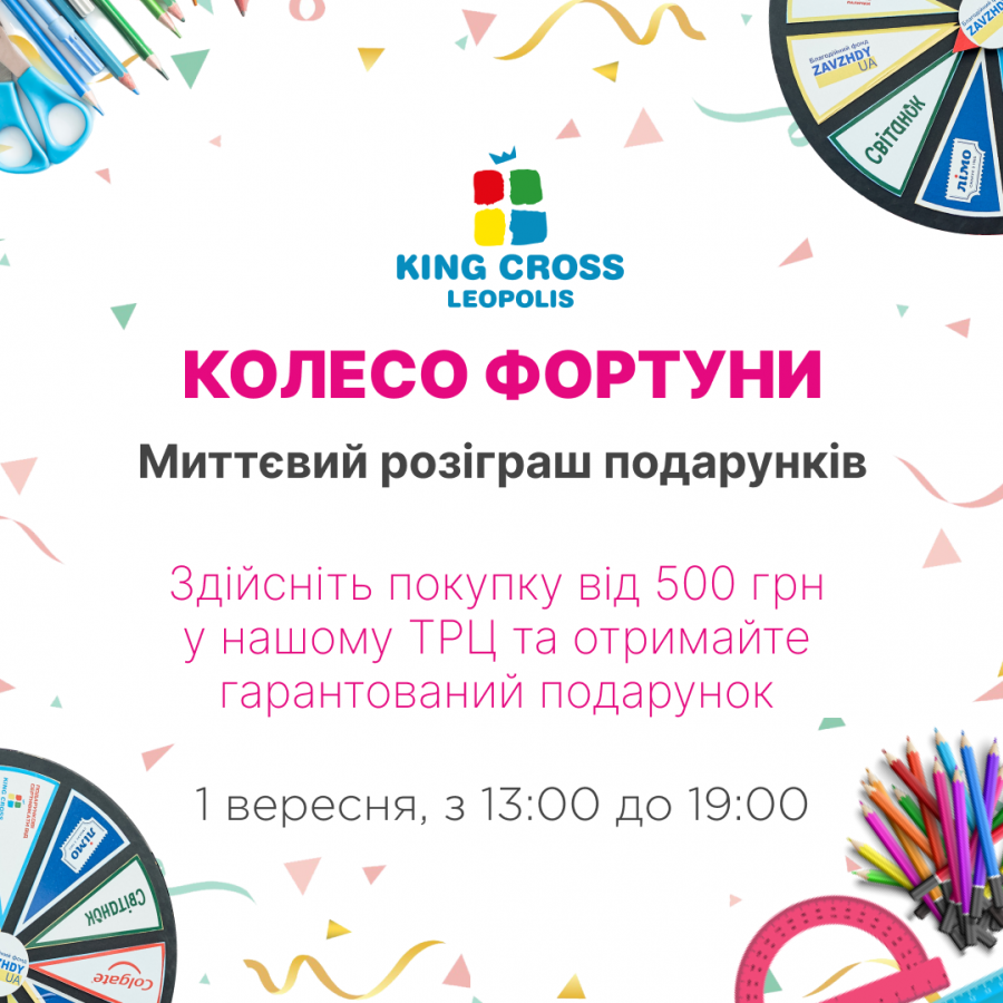 Умови акції: 1. Реєструйте чек на суму від 500 грн з будь-якого магазину чи закладу ТРЦ; 2. Крутіть «Колесо Фортуни»; 3. Отримуйте гарантований подарунок від партнерів акції!