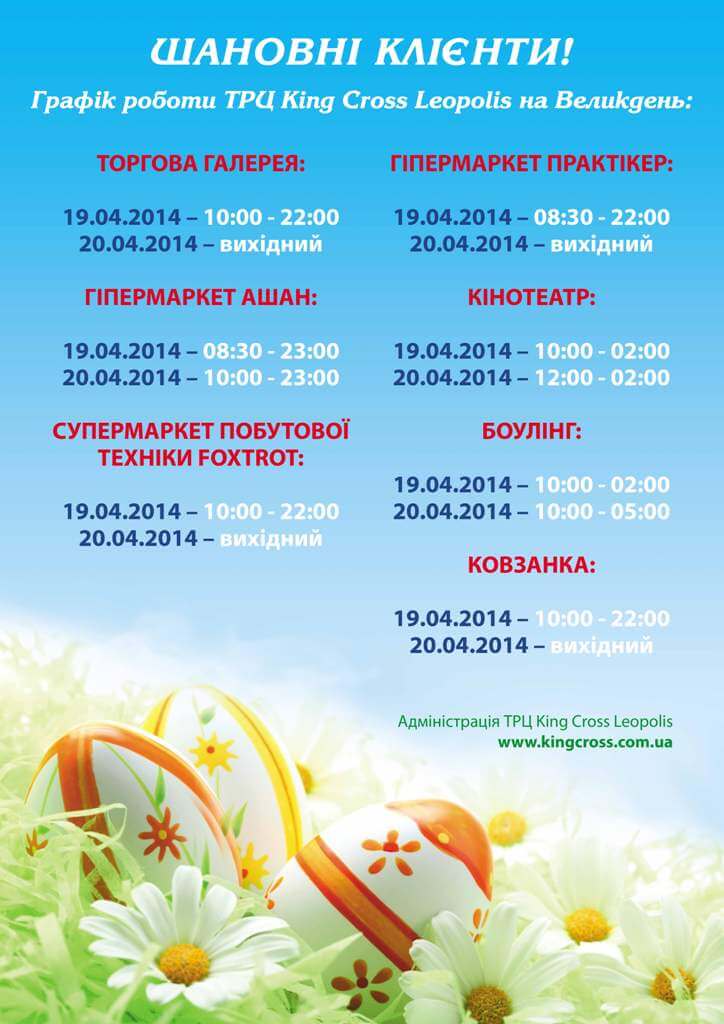 Розклад роботи ТРЦ King Cross Leopolis на Великдень