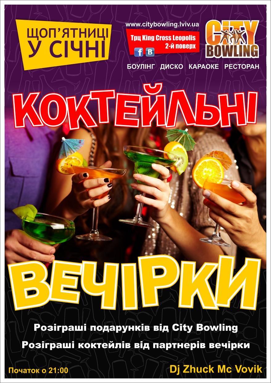Щоп'ятниці у січніБОУЛІНГ ДИСКО КАРАОКЕ РЕСТОРАНРозіграш коктейлів від партнера вечірки та подарунків від City Bowling.