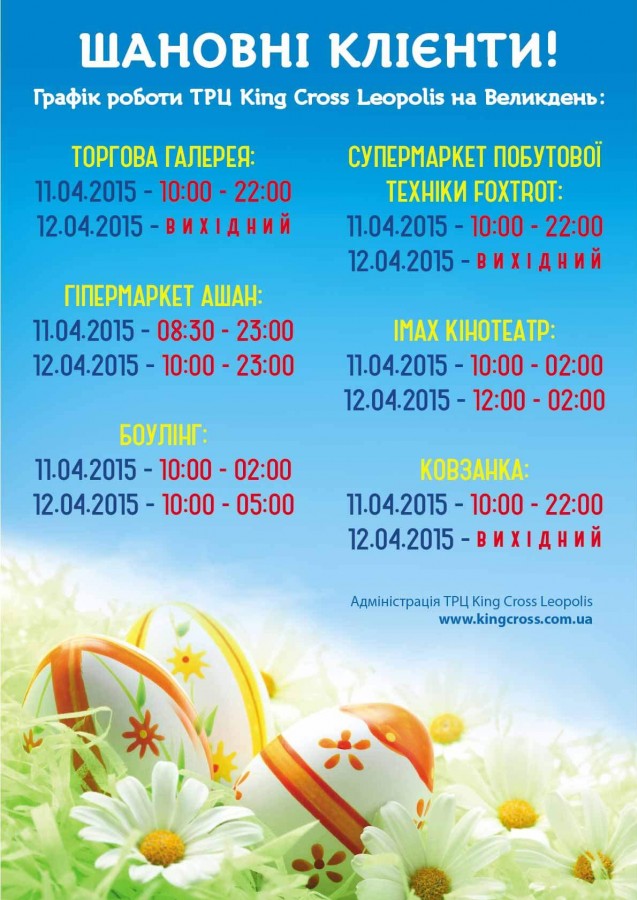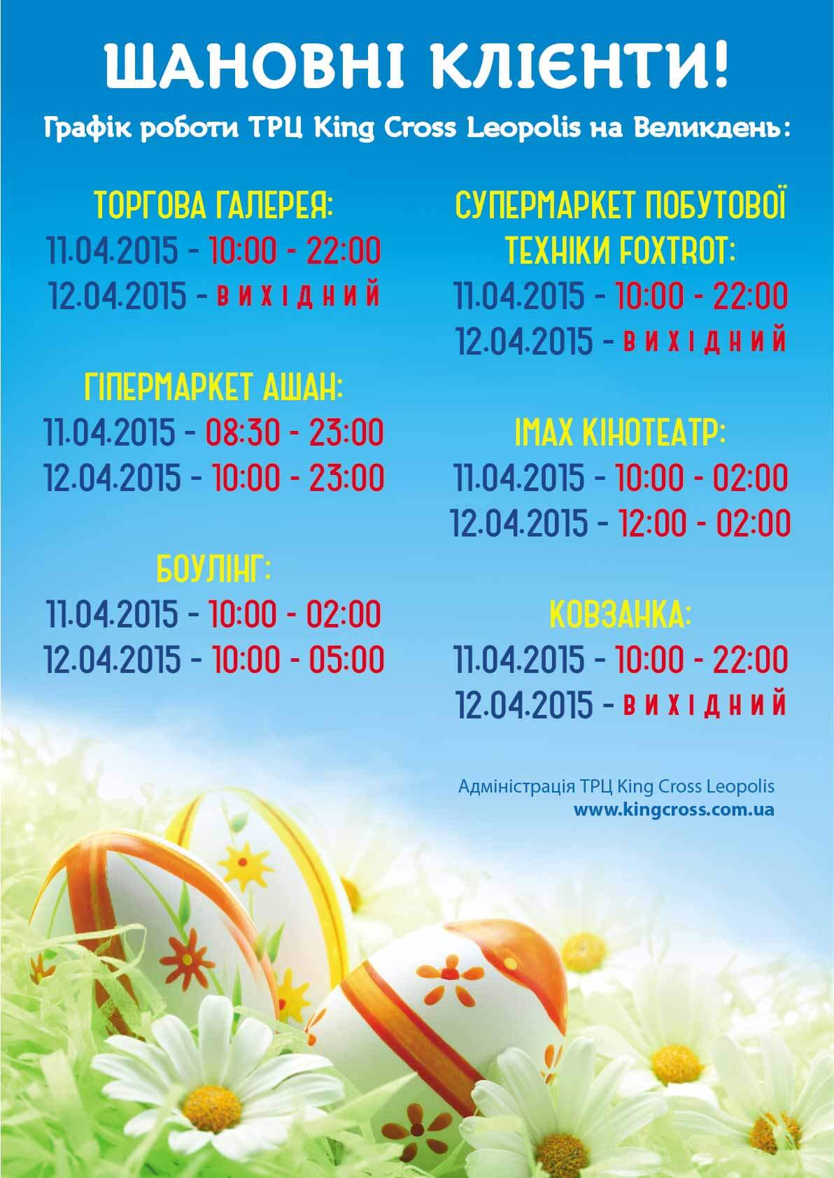 Графік роботи ТРЦ King Cross Leopolis на Великдень