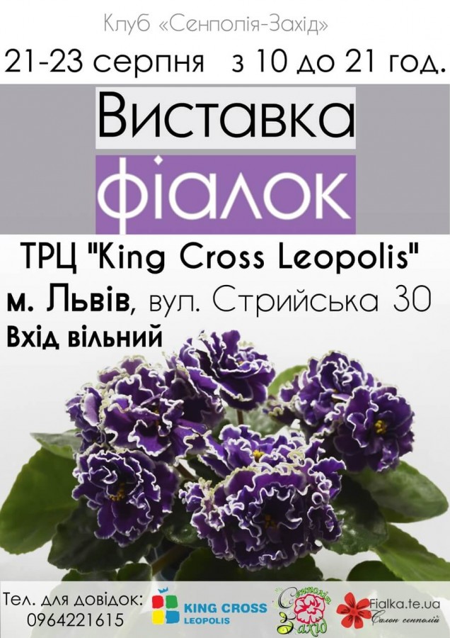 Клуб "Сенполія Захід" запрошує на Виставку фіалок, 21-23 серпня з 10.00 до 21.00, яка відбудеться в центральному холі ТРЦ King Cross Leopolis.