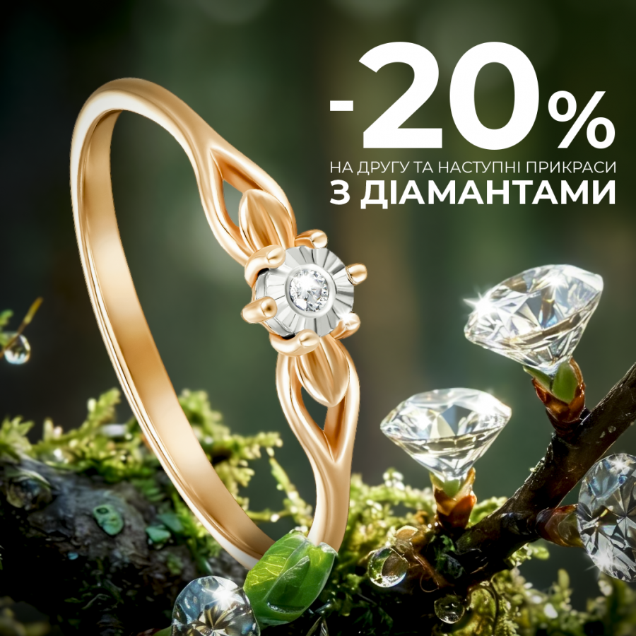 Купуй першу прикрасу з діамантами, а на другу та кожну наступну прикрасу з діамантами у чеку, отримуй ДОДАТКОВУ ЗНИЖКУ –20%!