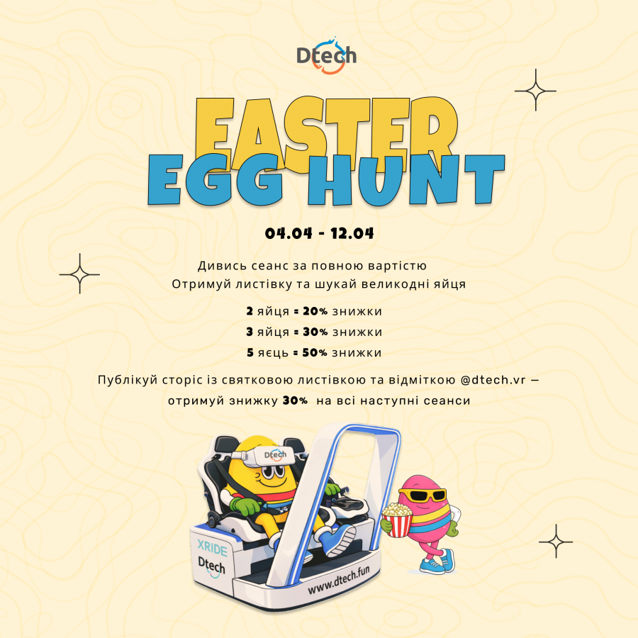 Приходь на будь-який наш атракціон, дивись сеанс за повною вартістю, шукай великодні яйця та забирай свої знижки