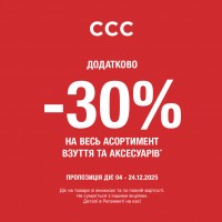 Додатково діє -30% на весь асортимент взуття та аксесуарів! Такої вигоди давно не було — тож саме час оновити гардероб, підібрати стильні подарунки або придбати те, що давно хотілося.